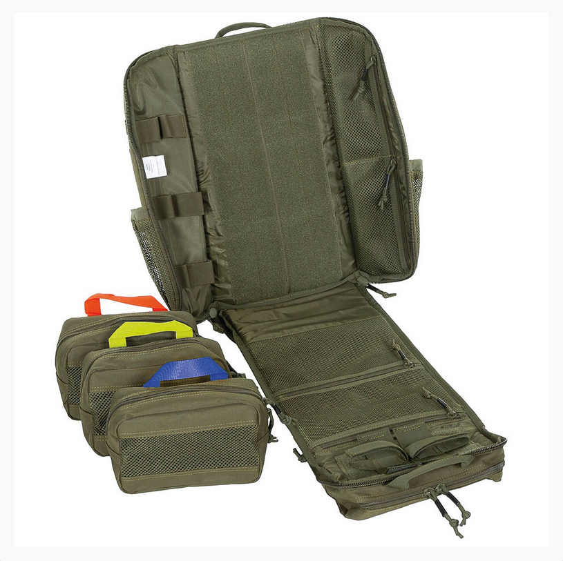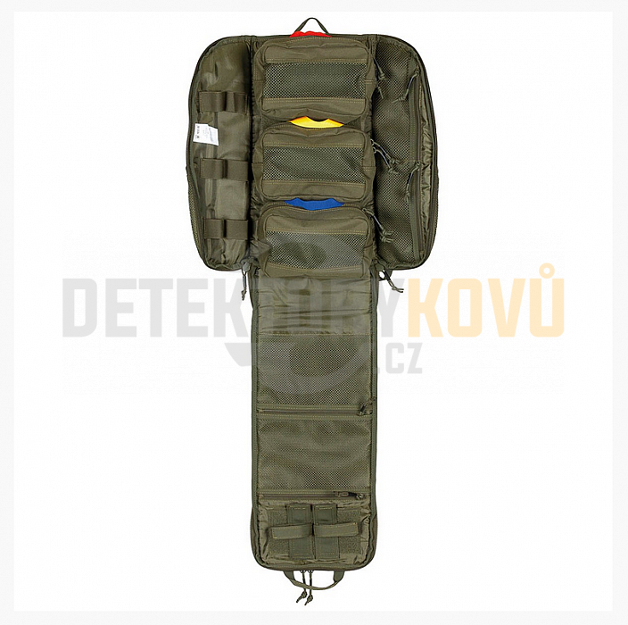 Hlavní komora se otevírá po celé délce pomocí dvoucestného zipu. Vnitřní zadní panel obsahuje velkou velcro plochu a 3 odnímatelné pouzdra s barevně odlišenými úchyty pro snadnou orientaci. Boční části doplňují elastická oka a 2 síťované kapsy na zip.