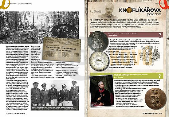 Osmdesáté výročí katastrofy jednoho z letounů Savoia-Marchetti Československých státních aerolinií připomíná Wood v článku Smutná vzpomínka na vzdušnou krásku. Na vaše dotazy ohledně nálezů knoflíků odpovídá v pravidelné rubrice Knoflíkářova poradna jejich sběratel a znalec Ivo Tomáš. Těm, kteří se nechtějí ke svým nálezům chovat macešky, či je nesprávným ošetřením nevratně poškodit, je věnováno již sedmé pokračování našeho seriálu Konzervátorské doupě . Se zkušenostmi z praxe muzejního konzervátora se s vámi dělí Acci. Tentokrát poradí, jak pečovat o nálezy a půdovky ze dřeva. Rozhádali jste se někdy kvůli nálezům či lokalitě? je otázka, kterou jsme hledačům položili v další stálé rubrice Anketa. Na počátky detektoringu v Čechách v devadesátých letech i později vzpomíná v pátém ze série rozhovorů s Kasandrem legendární hledač Nek, tento se jmenuje Jak jsem hledal darováky“. Zájemci o vojenskou techniku jistě uvítají další studii z pera historika vojenské techniky Jana Škarky 15cm kanon NO a 22cm moždíř ON. Milovníky povídek určitě potěší Fáze tři - třetí díl z cyklu povídek nejen pro hledače z pera spisovatele a hledače Zdeňka Jarchovského.
