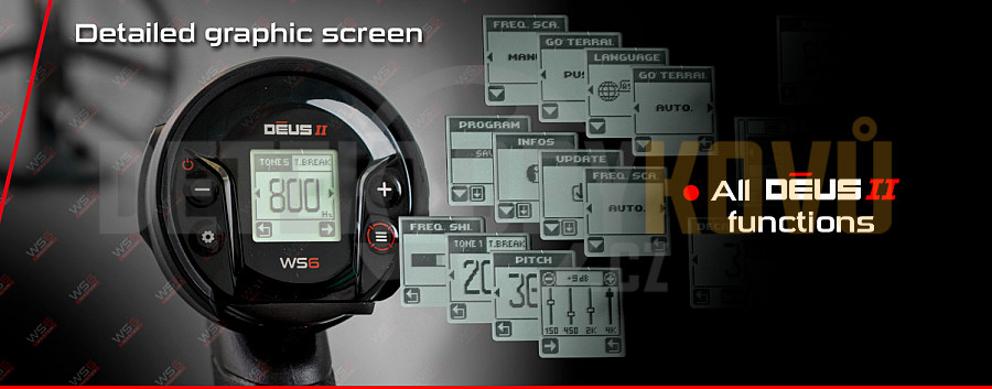 Pomocí bezdrátového sluchátkového modulu WS6 můžete ovládat všechny funkce detektoru XP DEUS II. Modul umístíte od držáku na teleskopickou konstrukci XP a máte tak před sebou například číselnou identifikaci nálezů. Díky grafickému displeji modulu WS6 je velikost ID stejně velká jako na hlavní jednotce. K detektoru jsou dále dodávána bezdrátová sluchátka XP WSA STEREO, díky kterým si užiteje volnost pohybu bez jakýchkoliv kabelů a především novou funkci MULTIZPRACOVÁNÍ.