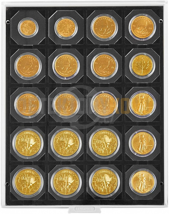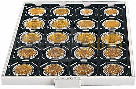 Sběratelský mincovní kazeta Lindner CARBO. Nabízí 20 čtvercových přihrádek o rozměru 50x50 mm na mincovní rámečky Lindner OCTO a mincovní pouzdra Lindner.