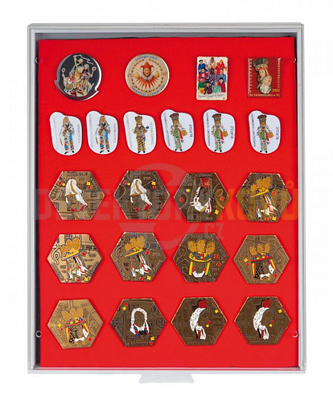 Kazeta od firmy Lindner na sběratelský materiál jako jsou odznaky, šperky, svátostky, medaile atd.