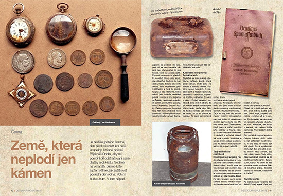 "Co vás při hledání nejvíce pobavilo?“ je otázka, kterou jsme hledačům položili v další naší stálé rubrice Anketa . O svém nálezu bronzového „kusu historie“ vypráví hledač Veny 75 v článku Můj velký poklad . Po stopách prvoválečných bojů v Karpatech se ve své poutavé „retroreportáži“ Karpaty po dvaceti letech… vydává náš kmenový autor acci . Depot turistických známek dal hledači Kódlovi nahlédnout do historie jedné šumavské horské chalupy a vy si o tom přečtete v reportáži Vzpomínka na Hrnčíře. Nepředstavitelné množství zlata, stříbra a drahých kamenů ukryli Němci na konci války před blížící se Rudou armádou. Jak úspěšně po těchto pokladech pátrají hledači u našich západních sousedů se dočtete v článku Víc zlata než na Ostrově pokladů. Na Svatou Horu (u Příbramě) vás zavede dvacátý první díl Soupisu čs. svátostek od Bedřicha Přibila .