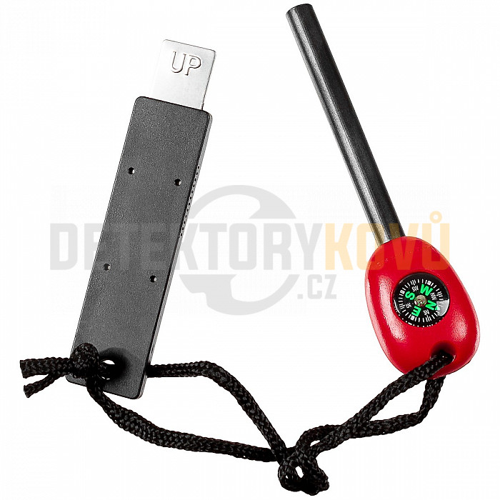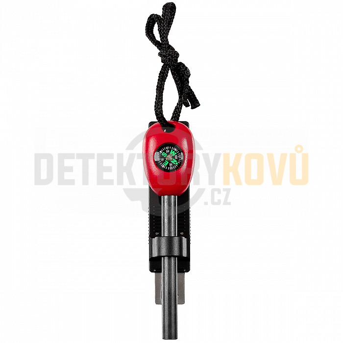 Součástí je ocelový firesteel a škrabka, které při správném použití vytvářejí silné jiskry s vysokou teplotou. Integrovaný kompas v rukojeti slouží jako základní orientační pomůcka v terénu, což zvyšuje využitelnost nástroje při přežití v přírodě.