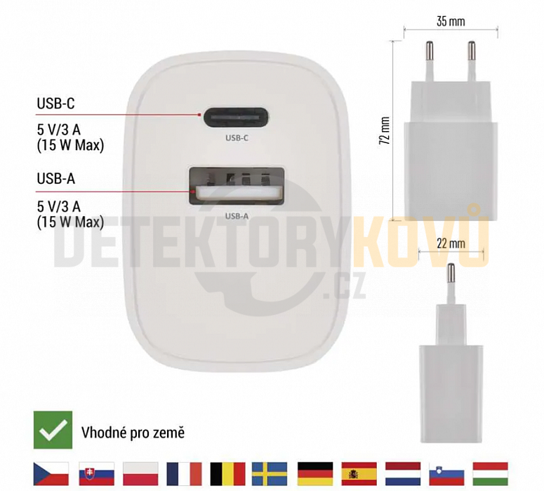 Adaptér je vhodný nejen pro smartphony a tablety, ale také pro metalodetektory a jejich příslušenství – například řídicí jednotky, bezdrátová sluchátka, pinpointery nebo nabíjecí powerbanky používané v terénu. Stabilní výstup 5 V / 3 A zajišťuje bezpečné a spolehlivé nabíjení citlivé elektroniky.