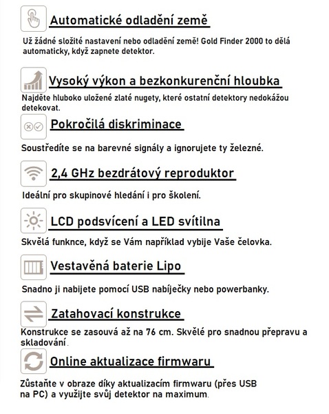 U detektoru Gold Finder 2000 byl kladený důraz na velmi jednoduchou obsluhu, kterou zvládne opravdu každý. Už se nemusíte stresovat s náročným odladěním země a složitým nastavováním detektoru.