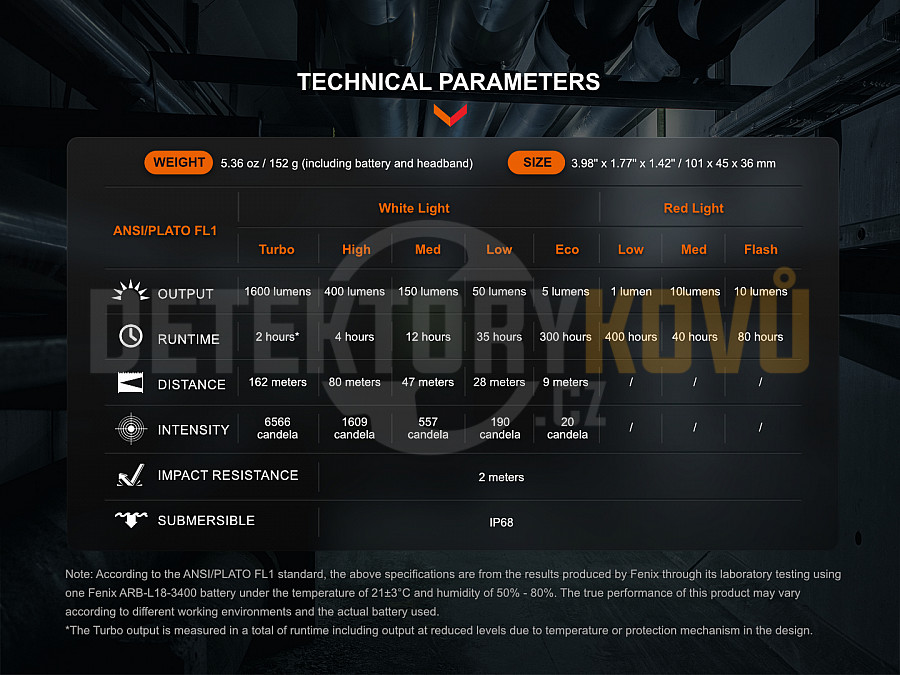 Všechny parametry svítilny (světelný tok, doba provozu na baterie, vodotěsnost, dosvit a nárazuvzdornost) jsou změřeny v souladu s normou ANSI/NEMA FL 1-2009.