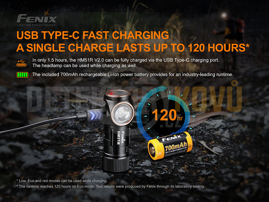 Druhá generace velmi oblíbené nabíjecí čelovky Fenix HM51R Ruby V2.0 nabízí světelný tok až 700 lumenů (ANSI) neutrálního bílého světla (4500 K) s dosvitem až 120 metrů a navíc je vybavena i červenými LED. Napájí ji jeden nabíjecí akumulátor typu RCR123A (je součástí balení), který se dobíjí přímo ve svítilně přes moderní USB-C konektor, alternativně lze k napájení použít i jednorázovou lithiovou baterii CR123A (s omezeným max. výkonem na 150 lumenů). V ovládacím tlačítku je navíc indikační LED, díky které budete vždy vědět, kdy dobít akumulátor. Koncovka svítilny je magnetická, takže ji lze snadno uchytit na cokoliv železného. HM51R disponuje devíti různými režimy osvětlení, které umožní volit mezi vysokým výkonem a dlouhou výdrží (až 120 hodin). Svítilna je napájena digitálně kontrolovaným konstantním proudem pro zaručení stálého světelného výkonu i při snižování napětí v bateriích (při jejich pozvolném vybíjení).